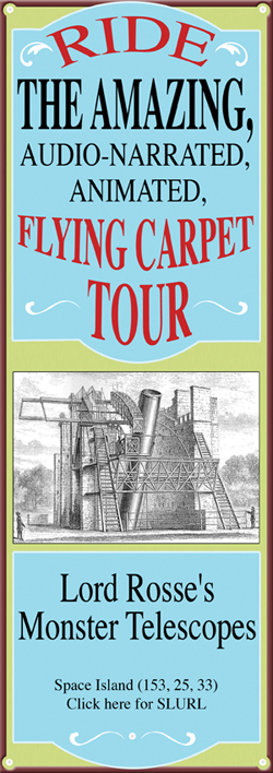 I designed and produced an audio-narrated, animated, musical flying carpet tour of Lord Rosse’s monster telescopes in Second Life (SL). It’s now gone, but Geo Meek (his SL name) made a video of the tour: