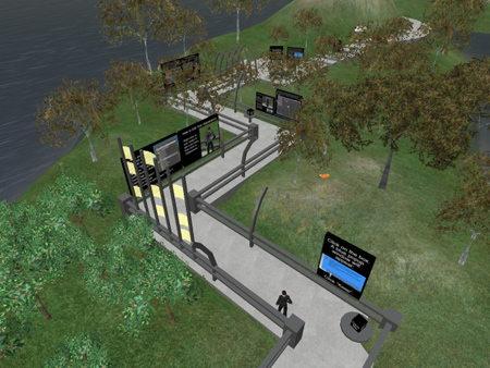 I helped make two orientations, one for people who registered on the Second Health website, and one for people who registered on the SciLands website. If you registered at the Second Health website, your new avatar would appear in SL on an island in the sim named UK Virtual Hospital. You would follow a path and read signs along the way to learn how to use Second Life. I terraformed that sim, planted the plants, built the path, and made most of the signs.